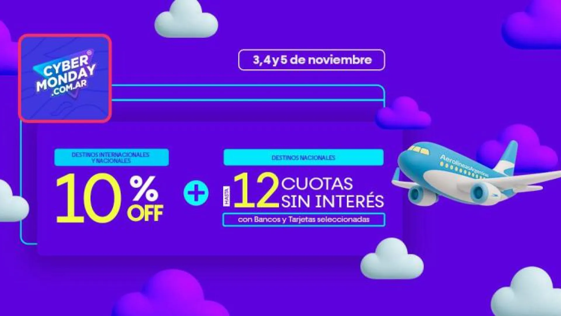 Del 3 al 5 de noviembre, los clientes de Aerolíneas Argentinas podrán acceder a pasajes aéreos con 10% de descuento para todos los destinos y financiación en cuotas sin interés en viajes dentro de Argentina, a través de una amplia red de bancos y tarjetas adheridas.