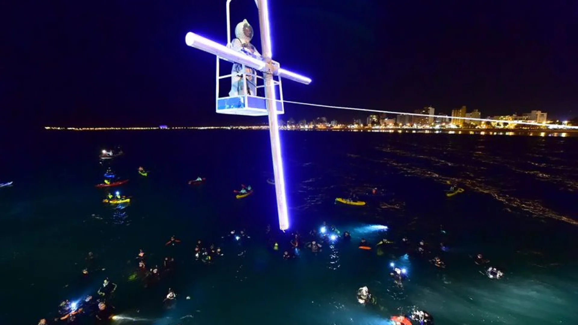 Entre quienes protagonizan este momento se encuentra, como cada año, “Pinino” Orri, reconocido buzo de la ciudad que desciende con su característica escafandra y acompaña el recorrido submarino de la cruz. A su alrededor se suman otros buzos, kayakistas y pequeñas embarcaciones que siguen el trayecto desde el agua, mientras cientos de personas observan desde el muelle y la costa. A medida que cae la tarde, el clima del evento adquiere una atmósfera particular: el público comienza a encender velas y, desde el mar, se proyecta el resplandor de la cruz iluminada, junto con las luces de los equipos que portan los buzos y las embarcaciones. La escena genera una postal única para quienes presencian el acontecimiento desde la costa o desde el muelle.